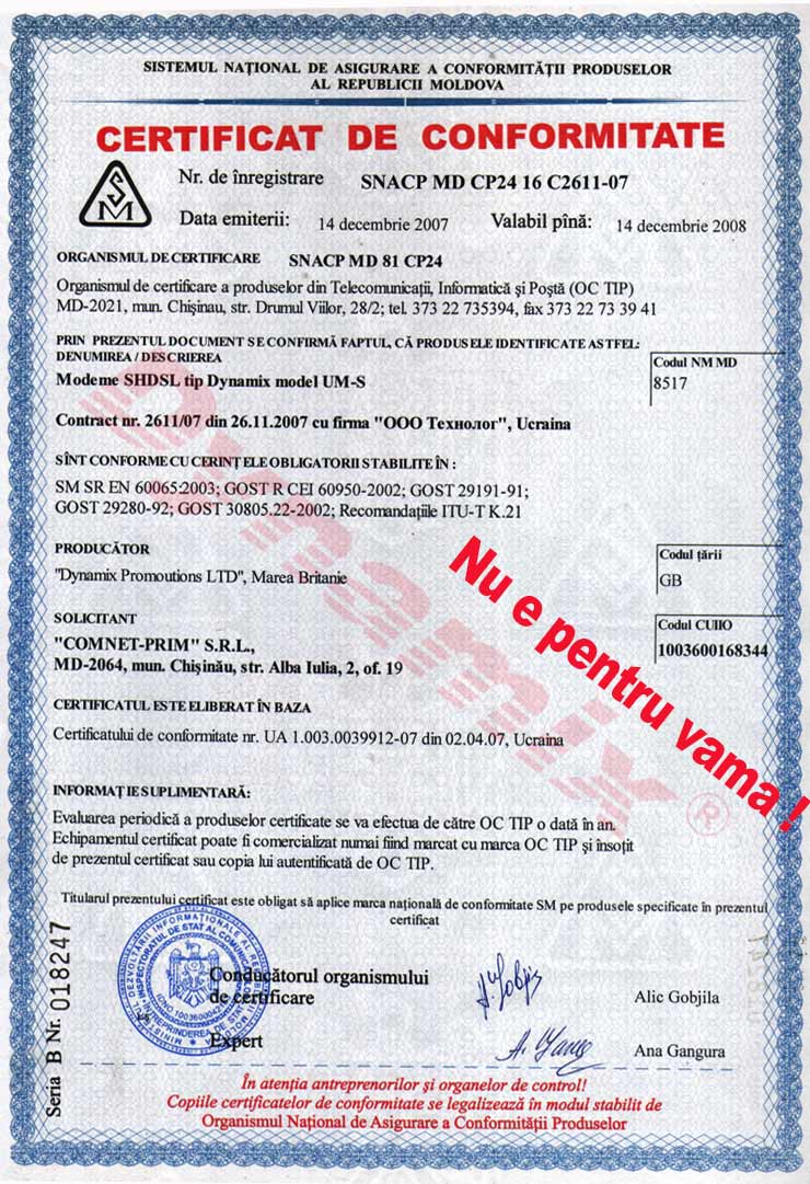 Отримано сертифікат відповідності на SHDSL модеми / маршрутизатори сімейства Dynamix UM-S в Молдові