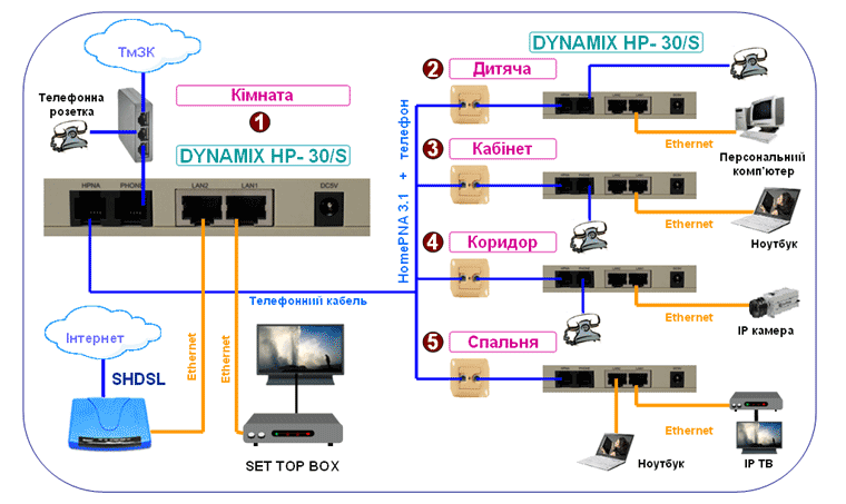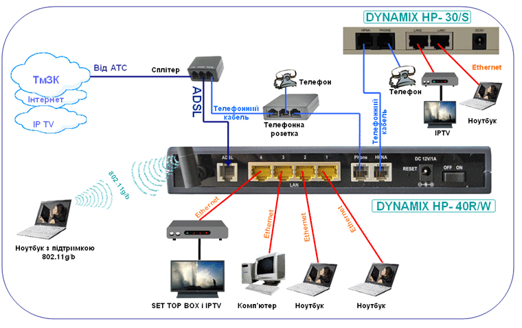 DYNAMIX HP-30/S), так і разом з ADSL2+ модемами/ маршрутизаторами серії DYNAMІ HP-40 (див. діаграми застосування нижче).