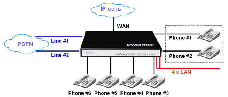 Dynamix DW2626 може функціонувати автономно, без підключення до IP мережі. Крім того, Dynamix DW 2626 може виконувати функції IP-АТС при підключенні його до IP мережі провайдера SIP VoIP сервісів.