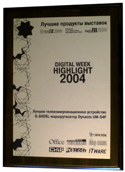 В 2004 году почетную награду в разделе "За лучшее телекоммуникационное решение" получил G.SHDSL маршрутизатор с 4 LAN-портами и поддержкой firewall, представленный компанией "Вектор"на своем стенде - DYNAMIX UM-S4F.