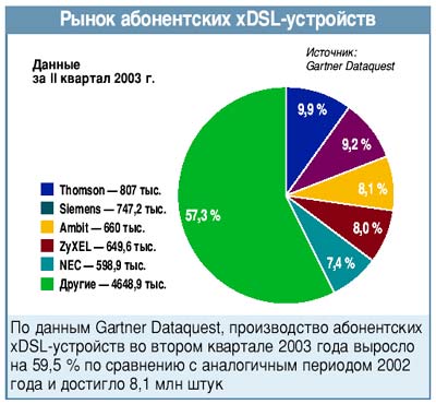 В США операторы Yahoo BB и NTT уже тестируют абонентские линии с ADSL2. Кроме того, в мае оператор Telenor заключил соглашение с Alcatel о расширении своей xDSL-сети, которая будет поддерживать решения Multi-ADSL (включает ADSL, ADSL2 и ADSL2+). Справедливости ради стоит отметить, что ADSL2/ADSL2+ пока делает первые шаги. Весьма скромен пока и рынок модемов с технологией второго поколения. Их в виде софтового расширения выпустили только некоторые производители (например, устройства Thomson SpeedTouch 580i и D-Link DSL-504G).