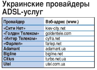 Приятно констатировать факт динамичного развития в Украине ADSL-услуг. Например, в Киеве пользователи сегодня могут получать услуги быстрого ADSL-доступа у провайдеров «Сити Нет», «Голден Телеком», «Интер Телеком», «Фарлеп», Adamant, Citius и Utel. При этом некоторые операторы (например, «Голден Телеком», Citius, «Фарлеп») развернули ADSL-сервисы на инфраструктуре своих телефонных сетей, другие же их предоставляют на телефонных линиях Укртелекома («Сити Нет», «Интер Телеком»).