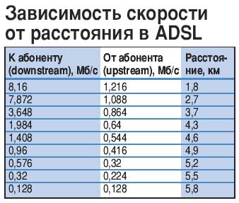 Поэтому разработчики весьма удачно распределили в ADSL скоростные возможности двух встречных потоков: пользователи могут получать данные на скоростях от 128 Кб/с до 8,192 Мб/с, а отправлять их со скоростью от 16 Кб/с до 768 Кб/с. При этом, чем короче и лучше состояние абонентской линии (толщина провода не менее 0,5 мм, отсутствие отводов, малый уровень помех), тем с большей вероятностью возможно достичь максимальных значений скорости. Обычно приема данных на скоростях 8 Мб/с можно достичь на линиях удаленностью до 2 км, в то время как на линиях протяженностью около 6 км трафик поступает на ПК со скоростью не более 128 Кб/с.