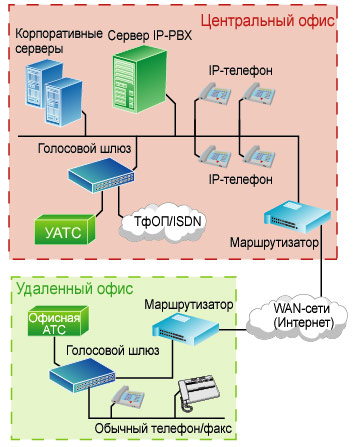 На помощь вновь приходит IP-телефония, но в лице отдельных голосовых шлюзов, которые дополнительно могут выполнять роль маршрутизаторов, сетевых экранов и др. С помощью шлюзов можно объединить трафик голоса и данных в один канал и передавать его (например, через Интернет) в центральный офис или другое подразделение, исключив при этом оплату за дорогие международные и междугородные звонки.
