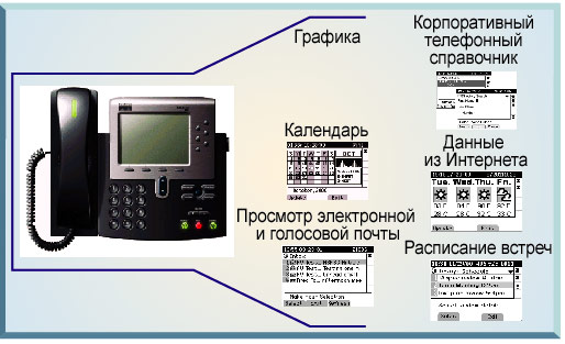 Сегодня же кроме экономических факторов немалым стимулом для внедрения IP-телефонии в сетях компаний являются новые услуги. Так, на IP-телефон можно получать информацию о текущем состоянии многих бизнес-процессов (например, финансовые показатели или цены на продукцию из базы данных), новости компании и распоряжения руководителей, курс валют, прогноз погоды, универсальные почтовые сообщения Unified Messaging (объединяющие e-mail, SMS, факс и голосовую почту). Кроме того, офисные IP-системы позволяют создавать мультимедийные центры обслуживания вызовов (см. ЧИП 6/2003, с. 92), принимающие вызовы по мобильным сетям, сетям ТфОП/ISDN и Интернету.