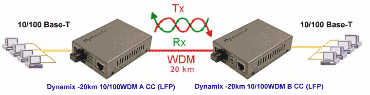 Dynamix -20km 10/100WDM BCC (LFP). Один оптичний медіаконвертер передає дані на довжині хвилі 1550nm, і одержує дані на довжині хвилі 1310nm, а
