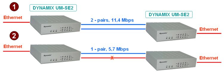 DYNAMIX UM-SE - мережевий подовжувач, що функціонує відповідно до нового стандарту IEEE 802.3ah “Ethernet in the First Mile” (EFM). Він дозволяє забезпечити гнучке і ефективне рішення по швидкісній передачі Ethernet трафіку в режимі “точка-точка” по мідних парах дротів. DYNAMIX UM-SE забезпечує симетричну смугу передачі даних до 22.8 Mbps при використанні 4 пар дротів і 11.4 Mbps при використанні двох пар і 5,7 - однієї пари. Що базується на стандартній технології EFM (2BASE-TL), мережевий подовжувач DYNAMIX UM-SE може бути швидко розгорнутий на вже існуючій мідній проводці і дозволяє економічно ефективно надавати високошвидкісні послуги Ethernet. |