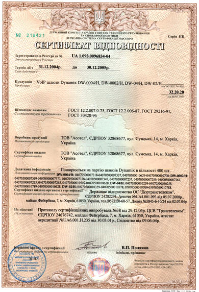Сертифікат відповідності на Dynamix DW