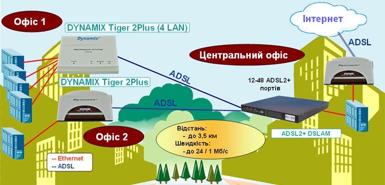 ніж відправляють. При цьому центральний офіс може, за узгодженням зі службами АТС, установити на АТС власний концентратор (DSLAM) і виступати як самостійним провайдер ADSL послуг для своїх філій. При такій схемі, вихід в Іnternet може бути реалізований централізовано для всіх філій із центрального офісу.