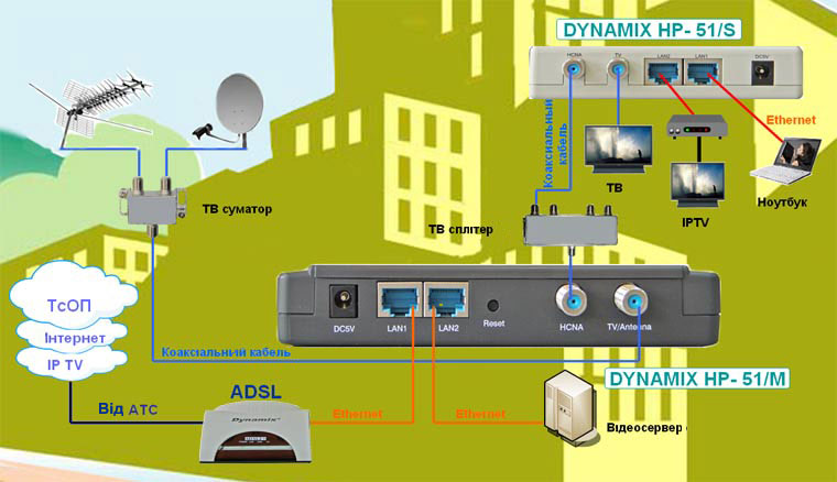 Підключення квартир (номерів в готелях) до Internet по коаксіальному ТВ кабелю з допомогою MDU HCNA моста DYNAMIX HP-51/S