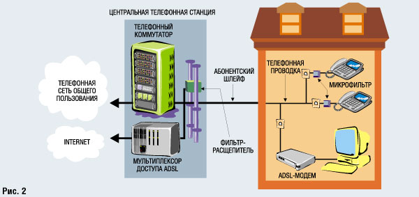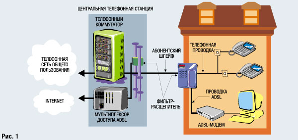Splitterless ADSL (G.Lite) Леонид Бараш Хотим мы этого или нет, но Internet неумолимо вторгается в нашу жизнь, становясь столь же привычной и даже необходимой ее частью, как и телефон. Это не так заметно в странах с нестабильной экономикой, но на Западе прогнозы буквально ошеломляющие. Ожидается, что сегодняшнее количество пользователей, а их более 110 млн., возрастет к 2005 г. до 475 млн. Их все больше привлекают такие требовательные к полосе пропускания Web-приложения, как покупки в режиме on-line, дистанционное обучение, push-технологии, видео по запросу и телекоммютинг. Для всех этих приложений необходим высокоскоростной доступ к Internet, который создает беспрецедентную нагрузку на существующие телефонные сети, первоначально рассчитанные только на голосовой трафик.Проложенный почти 50 лет тому назад медный кабель уже не в состоянии справиться с "бурным потоком" данных, который несет эпоха Internet. Перед телефонными компаниями реально встала угроза необходимости замены существующей проводки с целью удовлетворения требований новых систем доставки информации. Мечта о том, чтобы проложить оптоволокно к каждому дому, разбилась о рифы проблем, связанных с масштабом и стоимостью задачи. Вместо этого телефонные компании занялись проводкой оптоволоконных кабелей между центральными телефонными станциями, оставляя медный кабель в качестве "последней мили". Однако еще раньше они начали повсеместный переход на цифровые коммутируемые сети. А разработанная ими аналоговая технология ADSL (Asymmetric Digital Subscriber Line), или полноскоростная (Full-Rate) ADSL, преследовала цель доставить высокоскоростной цифровой сервис по существующей "медной" инфраструктуре. Распространение Internet в середине 90-х заставило телекоммуникационные компании несколько изменить взгляд на роль ADSL и рассматривать ее как механизм доставки голоса и высокоскоростных данных потребителю. Но несмотря на то что функционально эта технология почти идеально удовлетворяла возложенным на нее задачам, ее успешному распространению препятствовали довольно высокая стоимость и некоторая сложность. Дело в том, что Full-Rate ADSL предполагает использование фильтра-расщепителя (splitter) для разделения голосового сигнала и потока данных на обоих концах линии (рис. 1).
